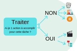 Une fois toutes les tâches en suspens listées, vous allez les "clarifier" : posez-vous la question "Ai-je une action à faire concernant cette tâche ?", "Est-elle prioritaire ?". 2 choix possibles :