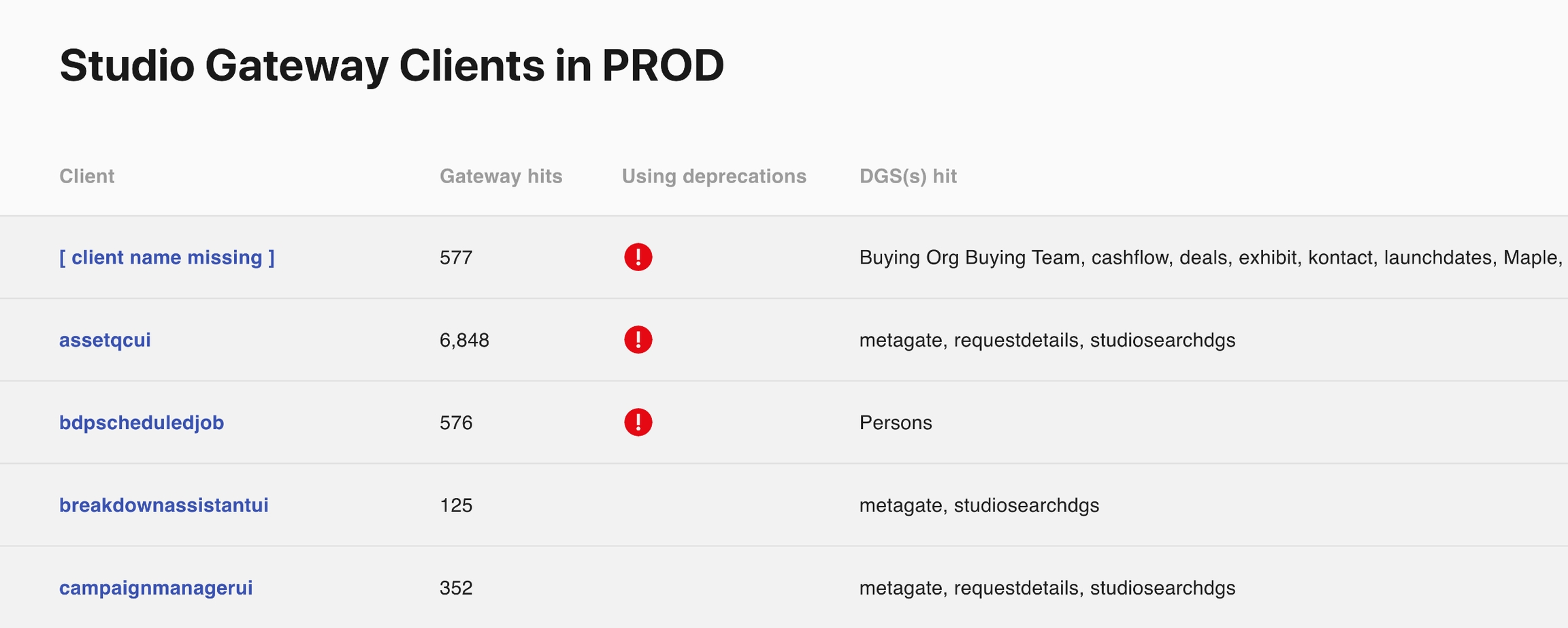 We have a deprecation workflow in place for evolving the schema. We’ve leveraged GraphQL’s deprecation feature and also track usage stats for every field in the schema. Once the stats show that a deprecated field is no longer used, we can make a backward incompatible change to remove the field from the schema.Clients with Deprecated Field Usage