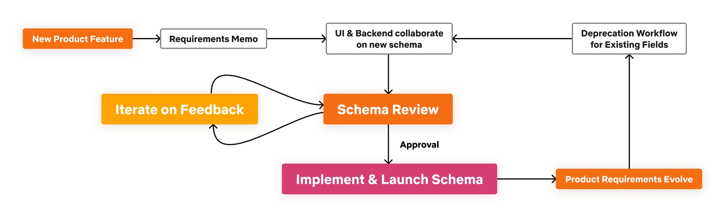 Our goal was to design a GraphQL schema that was reflective of the domain itself, not the database model. UI developers should not have to build Backends For Frontends (BFF) to massage the data for their needs, rather, they should help shape the schema so that it satisfies their needs. Embracing a collaborative schema design approach was essential to achieving this goal.Schema Design Workflow
