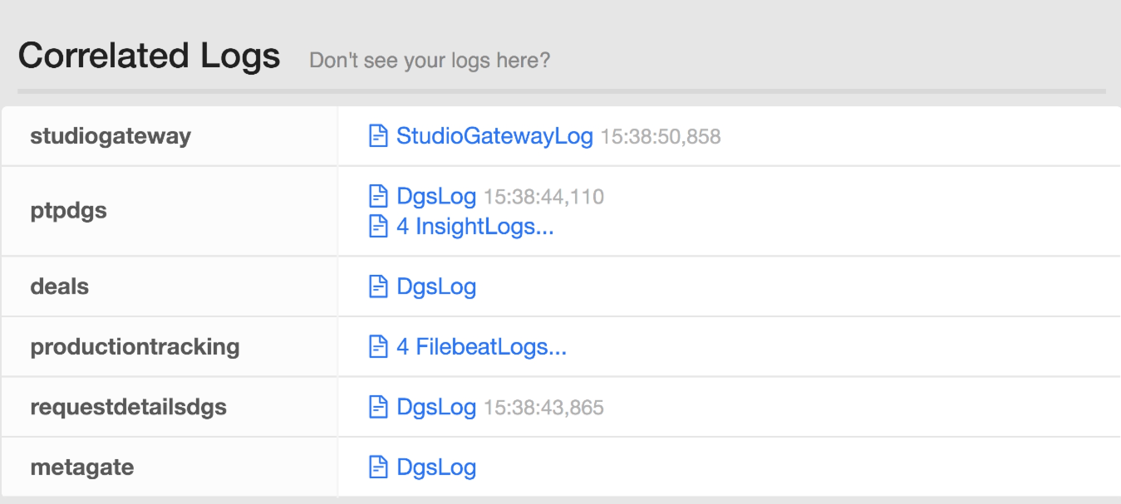 Distributed Log Correlation helps with debugging more complex server issues. By surfacing the application level logging details for all systems involved in processing a request, we gain deeper insights into what happened across the stack. Developers can easily see what was happening around the same time as a given request, to inspect surrounding factors that might have impacted an interaction.Logs across multiple services for a Federated Request