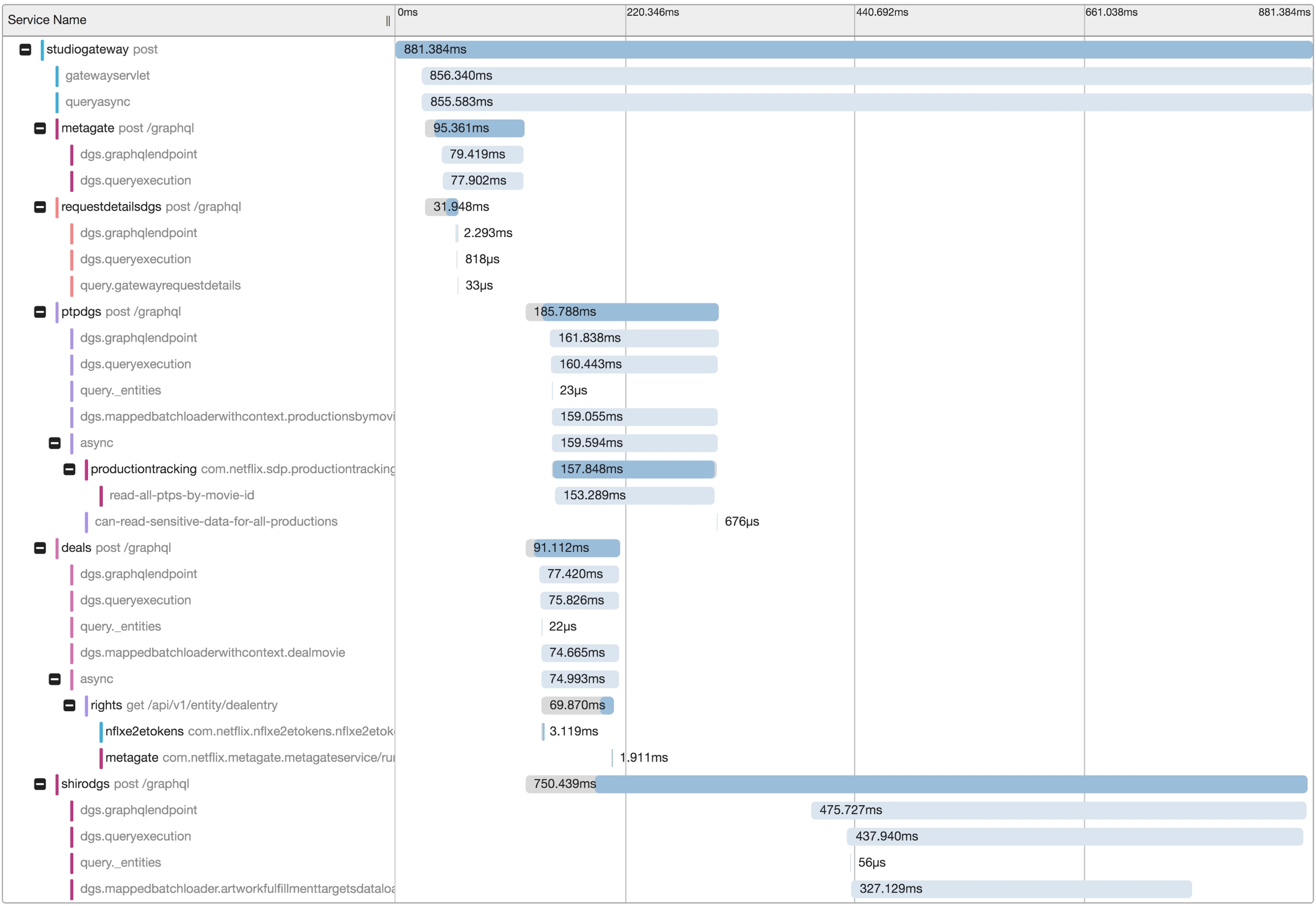 We teamed up with experts from Netflix’s Telemetry team. We integrated the Gateway and DGS architectural components with Zipkin, the internal distributed tracing tool Edgar, and application monitoring tool TellTale. In GraphQL, almost every response is a 200 with custom errors in the error block. We introspect these custom error codes from the response and emit them to our metrics server, Atlas. These integrations created a great foundation of rich visibility and insights for the consumers and developers of the GraphQL API.Edgar Trace for a Federated Request Lifecycle